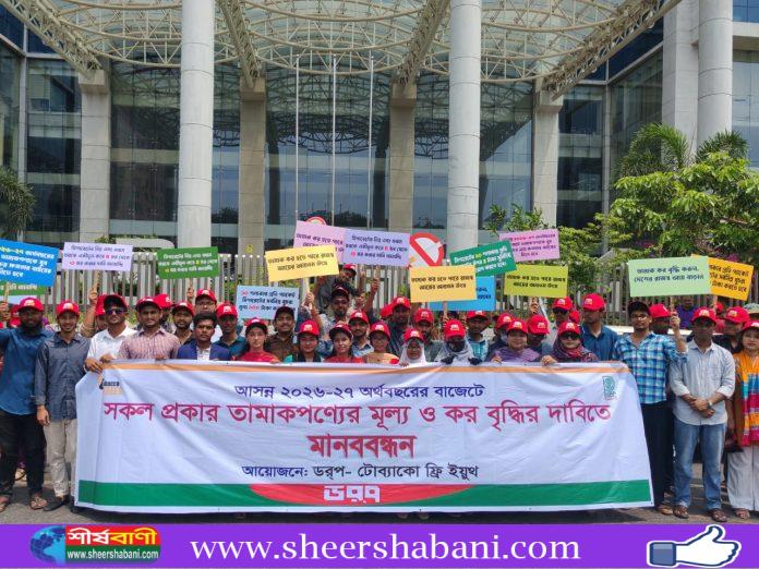আসন্ন ২০২৬-২৭ অর্থবছরের জাতীয় বাজেটে তামাকপণ্যের উপর কার্যকর করারোপ ও মূল্য বৃদ্ধির দাবি জানিয়েছে ডর্প টোব্যাকো-ফ্রি ইয়ুথ-এর সদস্যসহ বিভিন্ন বিশ্ববিদ্যালয়ের শতাধিক শিক্ষার্থী। সিগারেটের সহজ প্রাপ্যতা কমাতে এবং তামাকের ক্ষতি থেকে তরুণ সমাজকে রক্ষায়, শনিবার (২৫ এপ্রিল ২০২৬) সকালে আগারগাঁও জাতীয় রাজস্ব ভবন-এর সামনে আয়োজিত এক মানববন্ধনে এই দাবি জানান তরুণরা।